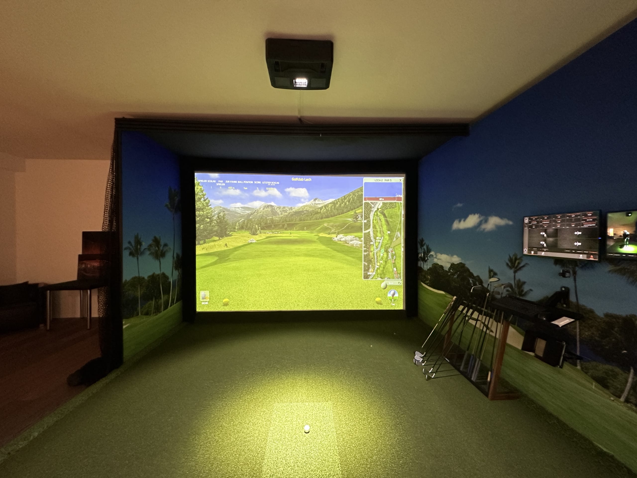 Die Seitenwände im Simulator wurden mit Golfplatzmotiven bedruckt, während der Kunde die äußere Gestaltung individuell passend zum Raumthema gewählt hat.